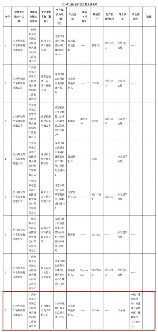 近日,广州市市场监督管理局发布了《2020年广州市投影机产品质量监督抽查结果》,结果显示在2020年第四季度,共抽查了8批次投影机样品,样品包含了极米、当贝、坚果等热门投影品牌,同时也有松下、爱普生等日系品牌。